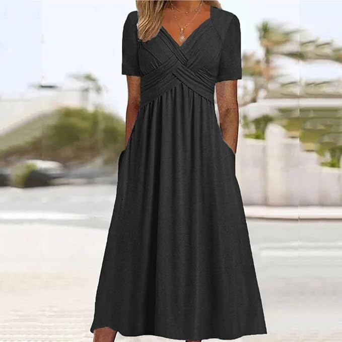 Womens Short Sleeve Dress Casual Plus Size V-Neck Maxi Dresses A Line Flowy Beach Sundress with Pockets